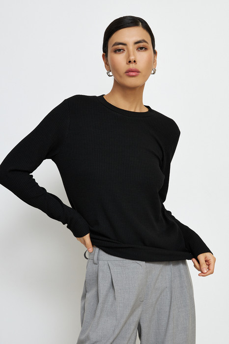 Джемпер свободного силуэта из фактурного эластичного полотна. Втачной длинный рукав. Круглый вырез горловины оформлен бейкой. Женский джемпер стал незаменимой и популярной разновидностью одежды, которая может применяться буквально во всех случаях жизни.