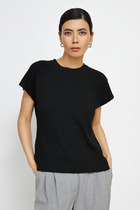 Жакет-бомбер из эластичного полотна, с покрытием, имитирующим кожу. Свободный силуэт с застёжкой-молнией и накладными карманами. Рукав втачной в спущенную пройму. Нижняя часть рукава и низ изделия присборены на резинку. Линия горловины оформлена воротником-стойкой.