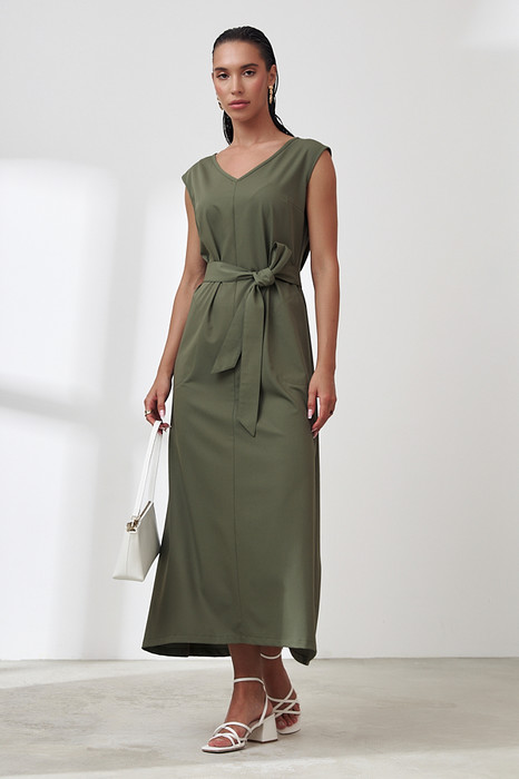 Платье полуприлегающего силуэта, чуть расширенное книзу из вискозной плательной ткани. По центру передней и задней части изделия выполнен шов. V-образный вырез горловины и линия проймы оформлены косыми бейками. Низ изделия асимметричной длины (спинка чуть удлинена относительно переда). В боковых швах карманы с настроченным контуром. В комплекте пояс из основной ткани.