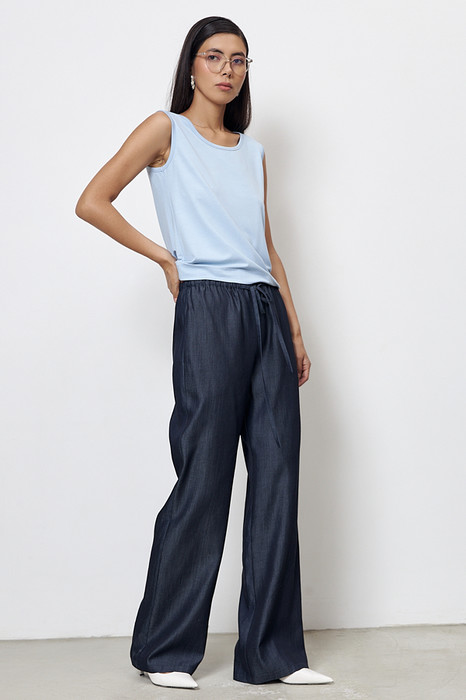 Брюки прямого силуэта из ткани Tencel. Пояс с эластичной резиной и кулиской, в боковых швах карманы.