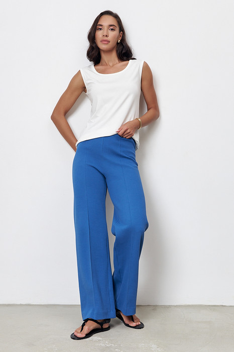 Брюки из эластичного полотна прямого силуэта. Пояс с эластичной резиной. На передней части брюк застрочены стрелки.