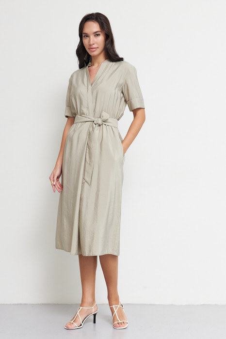 Платье из вискозной ткани с крэш-эффектом свободного силуэта. Изделие отрезное по линии талии с резинкой. Лиф платья с запахом, фиксируется на пуговицу для удобства. На передней части юбки выполнена складка, имитирующая запах, в боковых швах карманы. Линия горловины оформлена воротником-стойкой. Втачной короткий рукав с отворотом. В комплекте пояс из основной ткани.