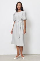 Платье из хлопковой ткани отрезное по линии талии. Изделие прилегающего силуэта в области груди и свободного кроя в области бёдер, с карманами в боковых швах. Линия талии завышена. На полочке нагрудная вытачка переведена в широкий цельнокроеный пояс, завязывающийся сзади. На спинке — талиевые вытачки. Глубокий V-образный вырез горловины. Застёжка на пуговицы в нижней части платья. Рукав втачной, собран по окату и по низу рукава в густую сборку. Низ рукава обработан манжетой.