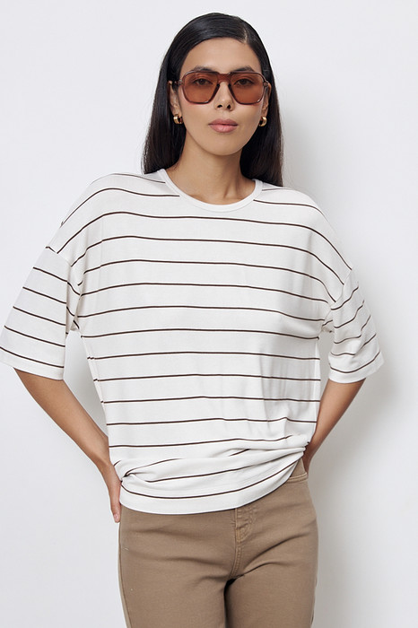 Джемпер из эластичного полотна. Свободный силуэт со спущенной линией плеча и рукавом до локтя. Вырез горловины окантован эластичной бейкой. В таблице размеров представлены параметры человека, а не изделия.