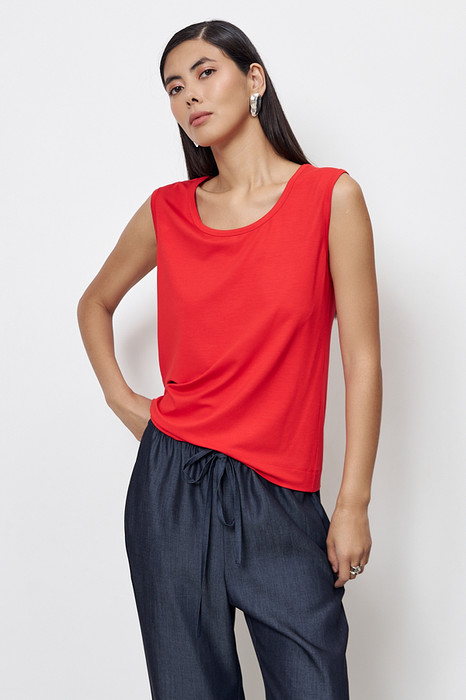 Топ из эластичного полотна полуприлегающего силуэта. Линия горловины и линия проймы окантованы эластичной бейкой.