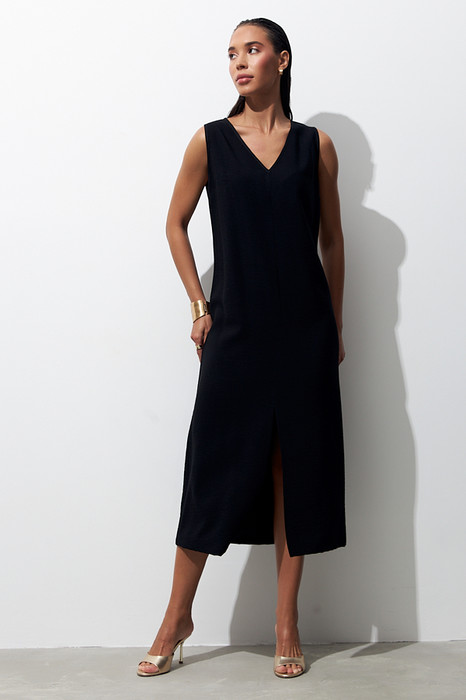 Платье из вискозной ткани с крэш-эффектом полуприлегающего силуэта. По центру передней части изделия выполнен шов, снизу разрез. V-образный вырез горловины и линия проймы оформлены косыми бейками.