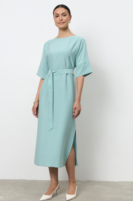 Платье из вискозной ткани с крэш-эффектом. Свободный силуэт, с разрезом в боковом шве. Круглый вырез горловины окантован косой бейкой из основной ткани. Цельнокроеный рукав с притачной манжетой. В комплекте пояс из основной ткани. В таблице размеров представлены параметры человека, а не изделия.