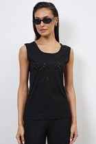 Топ из эластичного полотна с перфорацией. Изделие полуприлегающего силуэта. Линия горловины и линия проймы окантованы эластичной бейкой.