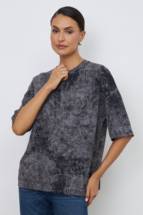 Джемпер свободного силуэта со спущенной линией плеча и рукавом до локтя выполнен из эластичного полотна. Вырез горловины оформлен бейкой из основной ткани. В таблице размеров представлены параметры человека, а не изделия.