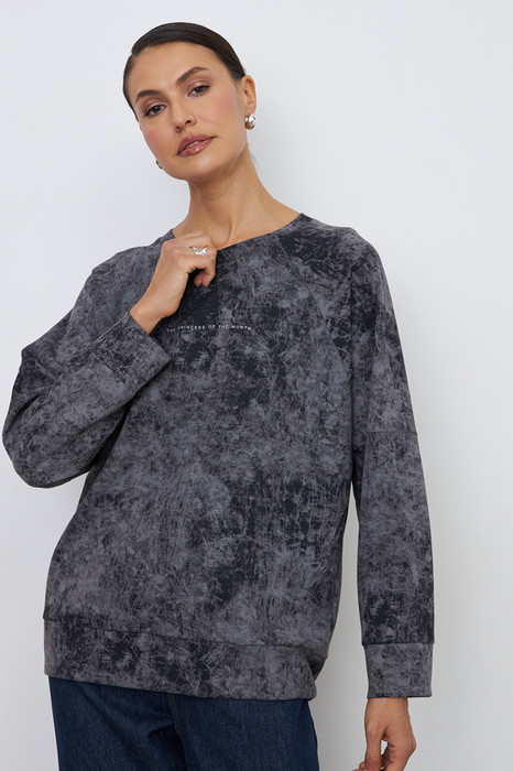 Свитшот свободного силуэта из эластичного полотна. Круглый вырез горловины оформлен бейкой. Рукав реглан с горизонтальным швом в области локтевого сгиба. По низу изделия и рукавов выполнены притачной пояс и манжеты из основной ткани. В таблице размеров представлены параметры человека, а не изделия.