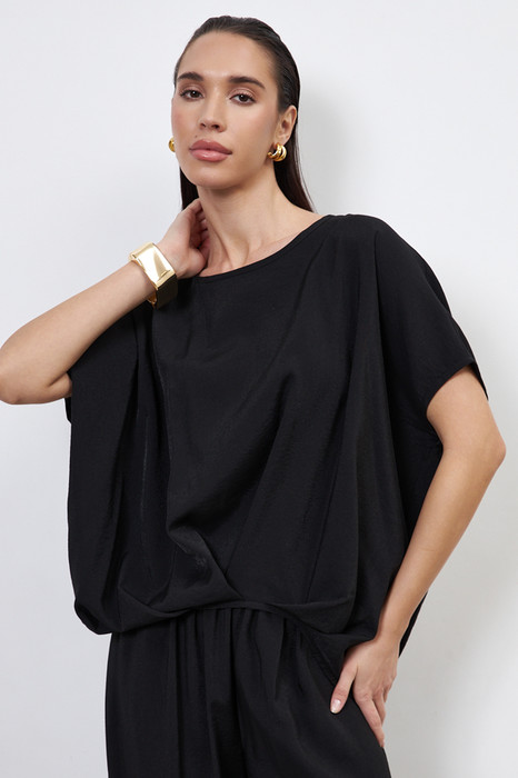 Блуза из вискозной ткани с крэш-эффектом. Свободный крой асимметричной длины (спинка удлинена относительно переда). Спущенное плечо. Линия проймы, линия горловина и низ изделия окантованы косой бейкой из основной ткани. Изюминкой являются оригинальные складки на передней и задней части изделия.