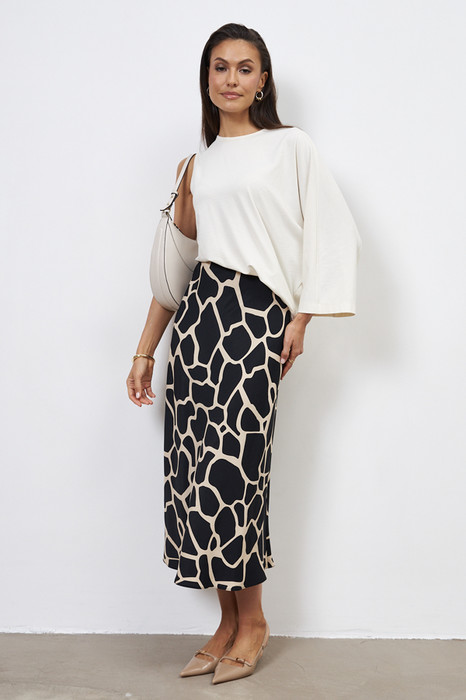 Юбка из вискозной ткани, слегка расширенная книзу. Крой юбки - по косой, на линии талии - скрытая резинка.