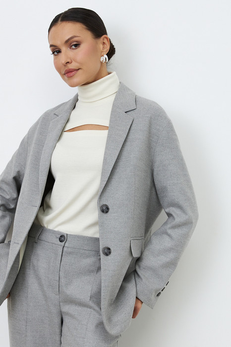 Жакет из костюмной ткани полуприлегающего силуэта. Изделие с английским воротником и застежкой на пуговицы. На передней части жакета выполнены карманы в рамку с клапаном. По центру задней части выполнена шлица - элемент декоративный и необходимый. Обеспечивает свободу движения, добавляет шику и элегантности. Длинный рукав, снизу имитация шлицы с пуговицами. Жакет на подкладке.