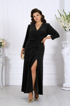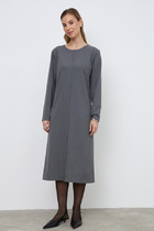 Платье из плательной ткани полуприлегающего силуэта, расширенное книзу. По центу передней части изделия и рукавов выполнена застрочка. Втачной длинный рукав. Круглый вырез горловины, сзади застёжка на петлю-пуговицу.