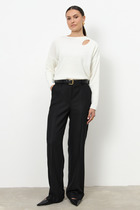 Брюки из костюмной ткани прямого силуэта. На передней половинке изделия выполнены карманы с подкройным бочком, на задней - талиевые вытачки и имитация карманов в рамку. Притачной пояс со шлёвками. Застёжка на молнию-гульфик и пуговицу. Такой крой выгодно подчеркнёт длину ваших ног.