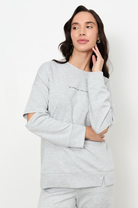 Джемпер из эластичного полотна свободного силуэта. Втачной длинный рукав оригинального кроя со спущенной линией плеча. Круглый вырез горловины оформлен бейкой. По низу изделия и рукавов выполнены притачной пояс и манжеты из основной ткани. В таблице размеров представлены параметры человека, а не изделия.