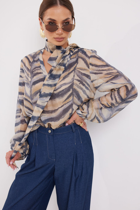 Блузка женская прямого силуэта выполнена из легкой современного дизайна ткани. Рукав длинный с легкой сборкой и манжетой по низу.  Перед с v- образным вырезом. Воротник стойка переходящая в завязку, образуя бант или узел.