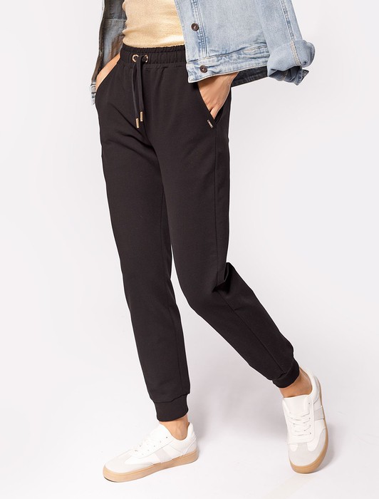 Состав: 92%Хлопок 8%ПУ Параметры модели на первом фото: Рост 170, бюст 83, талия 64, бедра 88Черные брюки джогерры выполнены из эластичного футера двухнитки. Модель дополнена двумя карманами и поясом с регулируемым шнурком. В завершённый образ возьмите свитшот D49.945, D49.948 или свободное худи.