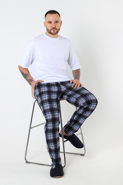 Брюки из полотна с набивным рисунком, классического покроя, прямые, на притачном поясе с эластичной тесьмой внутри, с карманами в боковых швах. Входы в карманы окантованы основным материалом.