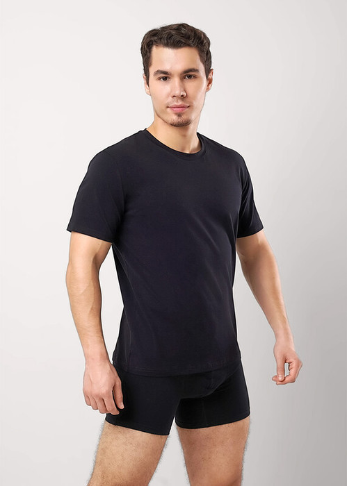 Футболка мужская из трикотажного полотна, с круглым вырезом горловины и коротким рукавом. Материал эластичен, не сковывает движений, благодаря хлопку в составе обладает дышащими свойствами.
