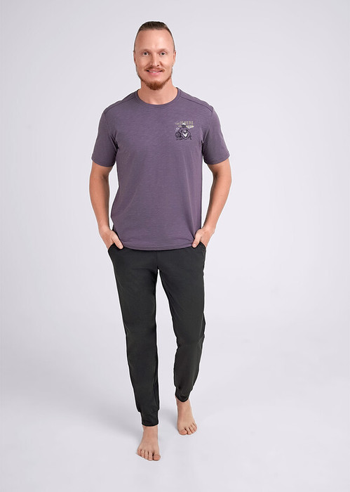 Комплект мужской состоящий из футболки и брюк. Футболка из фактурного трикотажного полотна с коротким рукавом, спереди авторский принт. Брюки из трикотажа на широком поясе с резинкой и регулируемым шнуром, по бокам удобные карманы.