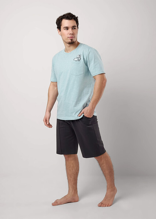 Комплект для дома, состоящий из футболки и шорт. Футболка из фактурного полотна с круглым вырезом горловины, коротким рукавом, карманом и стильным принтом. Шорты из трикотажа на эластичном поясе с функциональными карманами, защипами и шнуром.