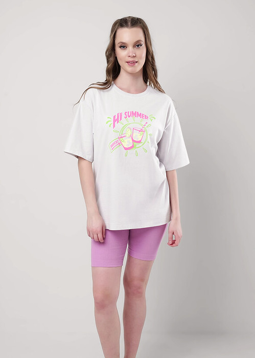 Пижама для дома.Футболка из трикотажного полотна. Округлая горловина с обтачкой. Втачной короткий рукав. Сзади средний шов.Спереди принт, нашивка.Шорты длинные, облегающие из трикотажного полотна кашкорсе.По талии притачная резинка жаккард, нашивка.