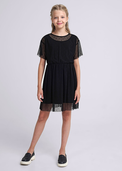 Нарядное платье свободного силуэта для девочки. Прямой рукав, круглая горловина, эластичная резина на талии. И верхний слой платья выполнены из сетки с узором, нижний слой - из хлопкового трикотажа.