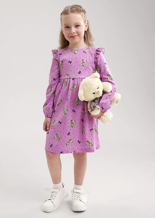Милое романтичное платье в набивку, выполненное из хлопкового трикотажа,- то, что нужно для создания классного повседневного образа! Модель с пышной юбкой и объёмными рукавами дополнена декоративными оборочками по плечам.