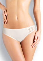 Трусы стринги. По ножкам и по поясу модель обработана резинкой с фестонами. Перед с левого бока украшен кружевом в две полосы с небольшим атласным бантиком.