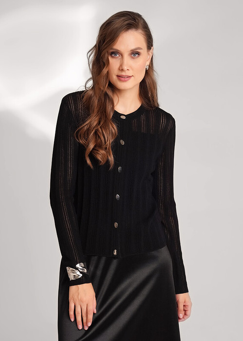 Вязаный жакет прямого силуэта из вискозной пряжи, ажурного переплетения. Втачной длинный рукав. Округлая горловина с бейкой. По переду планка с застежкой на пуговицы.