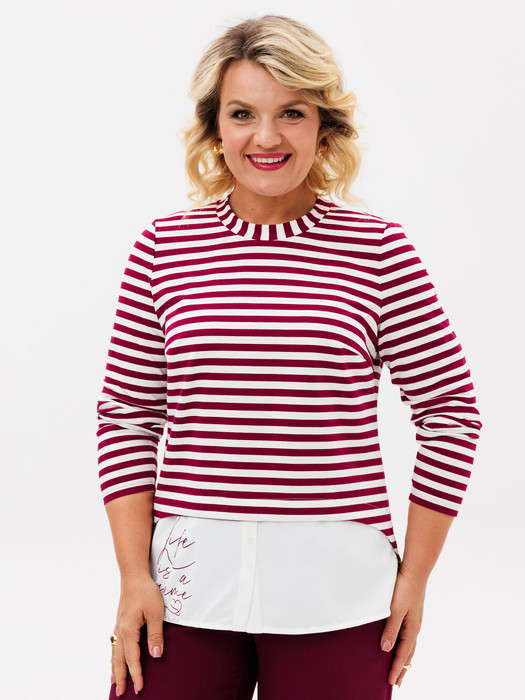 Стильный джемпер из хлопкового трикотажного полотна в трендовую полоску, с имитацией двухслойной блузки по низу, джемпер полуприлегающего силуэта, с длинными рукавами, с нагрудными вытачками по переду. Джемпер дополнена шрифтовым дизайнерским рисунком по низу изделия. Отлично сочетается как с любимыми джинсами, так и с классическими брюками.