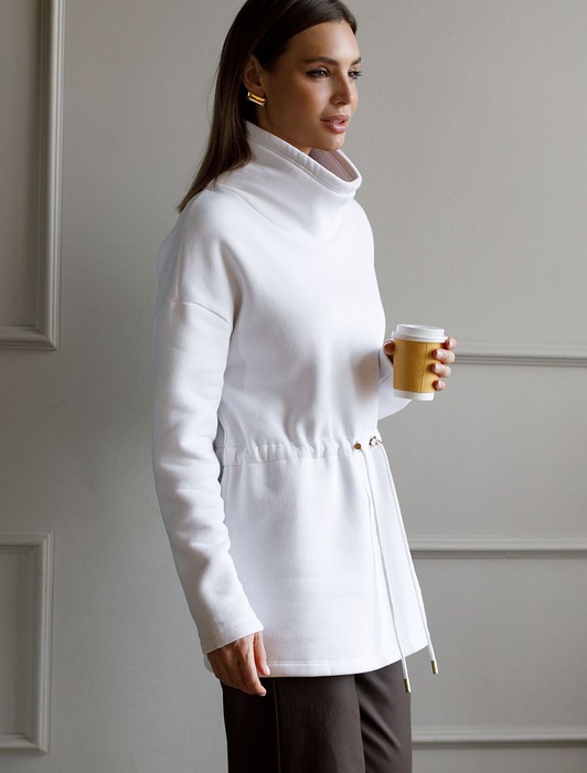 Состав: 80%Хлопок 20%ПЭ Параметры модели на первом фото: Рост 172, бюст 81, талия 59, бедра 88Джемпер выполнен из премиального футера-трехнитки. Модель с начесом дополнена хлопковым шнуром на талии регулируемым стопперами. Регулируя шнурок можно получить сразу две модели, свободный джемпер прямого кроя и дизайнерское решение с акцентом на талии. Соберите костюм вместе с брюками D44.129