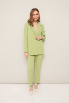 Комплект женский состоящий из блузки и юбки. Блузка прилегающего силуэта, отрезная по линии талии, вырез горловины-круглый, рукав 3/4 со складками по окату, застежка по спинке на пуговицы, изделие на подкладке, со съемным посом. Юбка прямая, зауженная к низу, на обтачке, застежка сзади на молнию, в среднем шве заднего полотнища-шлица, изделие на подкладке.