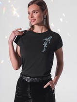 Блузон прямого силуэта, свободной формы, покроя спущенное плечо. Горловина округлой формы, обработана планкой. Спинка цельная. На переде расположены нагрудные вытачки, а так же подрез с правой стороны от вытачки, переходящий в разрез, дополнен тесьмой-бахромой со стразами. Рукава полной длины, низ обработан манжетами. На рукавах ассиметрично расположены прорезы, задекорированные тесьмой-бахромой со стразами. Блузон выполнен из трикотажного полотна.