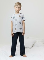 Пижама для мальчика, состоящая из футболки и брюк. Футболка - из гладкокрашеного трикотажного полотна "кулирка", классического покроя: с длинными втачными рукавами, горловиной овальной формы, обработанной втачной планкой и принтом в центре переда, выполненным в технике шелкографии. Брюки - из трикотажного полотна "кулирка" в клетку, длинные, с эластичной тесьмой на поясе и притачными манжетами из полотна "кашкорсе" черного цвета.