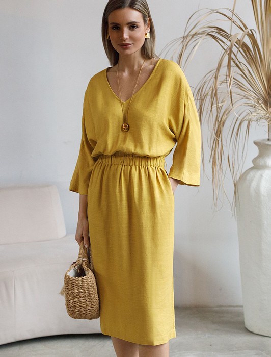 Состав: 70%Вис 30%ЛенПлатье выполнено изо льна с вискозой. Модель с V-вырезом и с цельнокроеным рукавом в стиле кимоно дополнено вшитым поясом из эластичной резинки. В комплект входит ремешок из эко-замши с золотистым кольцом. По бокам два кармана. Лён в составе обеспечивает прочность и воздухопроницаемость, вискоза эластичность и гладкость ткани. Благодаря такому сочетанию изделие хорошо драпируется, меньше мнется и сохраняет форму в течении долгого времени.