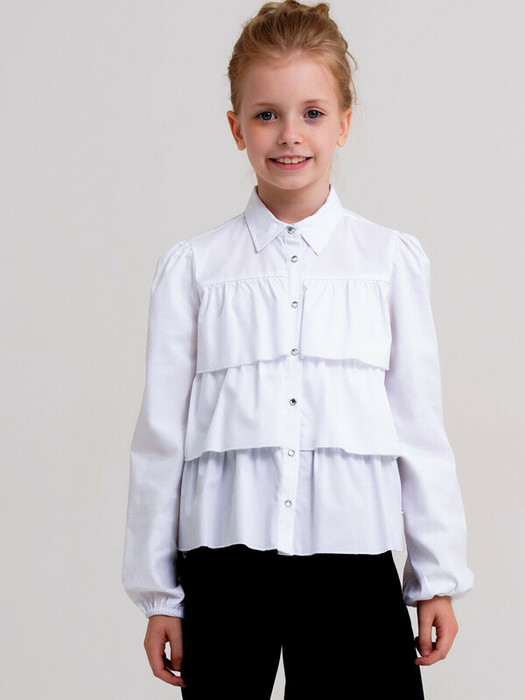 Белая нарядная текстильная блузка прямого силуэта, приталенная для девочки подростка. Школьная блузка на кнопках хорошо держит форму, комфортна в носке и проста в уходе. Высокое содержание хлопка. Рубашка в школу с длинным рукавом и интересным дизайном разнообразит повседневные школьные образы.