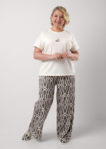 Пижама из хлопкового трикотажного полотна. Футболка прямого кроя,округлая горловина с обтачкой. Короткий цельнокроеный рукав.Спереди декоративные резы, принт, нашивка. Брюки прямые, свободные.Пояс на внутренней резинке.Боковые карманы с отрезным бочком.