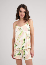 Пижама для дома и отдыха из хлопкового трикотажного полотна с добавлением модала. Майка с V-образным вырезом горловины. Узкая бретель с регулировкой длины. Горловина с внутренней обтачкой. Шорты с поясом на внутренней резинке.