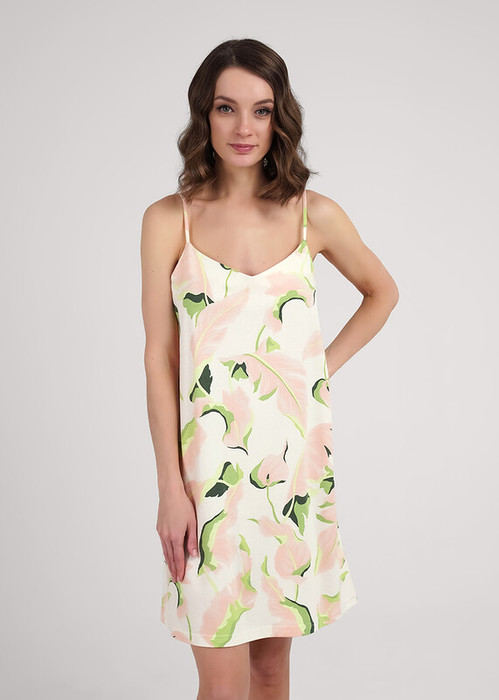 Сорочка ночная из хлопкового трикотажного полотна с добавлением модала, слегка расклешенная книзу. Узкая бретель с регулировкой длины. V-образный вырез горловины с внутренней обтачкой.