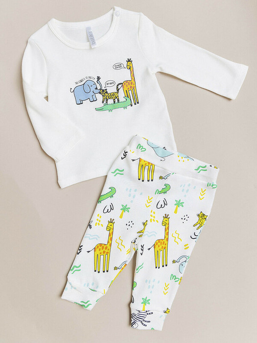 Пижама для мальчика: футболка с длинным рукавом и брюки. Выполнена из 100% хлопка, он прост в уходе и ему не требуется глажка. Футболка белая с рисунком и круглой горловиной на кнопках. Брюки на резинке цветные с манжетами в нижней части. Пижама подойдет для малышей от 3 месяцев до 2 лет.Характеристики:Ткань: 100% хлопок интерлок пеньеПроизводитель: batik
