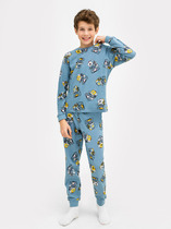 Трикотажный пижамный комплект из футера с начёсом, произведённого из натурального хлопка. У джемпера длинные рукава со спущенными плечами и эластичная мягкая горловина и манжеты. Брюки с удобным поясом на резинке, внизу манжеты. Оригинальная набивка выполнена из стойких, гипоаллергенных текстильных красителей. Все трикотажные полотна производятся в соответствии с нормами Швейцарского сертификата ЭкоТекс.