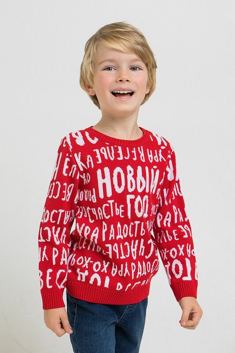 Вязаный новогодний джемпер  для мальчика из акриловой пряжи с узором. Длинные втачные рукава. Эластичные манжеты, пояс и горловина.