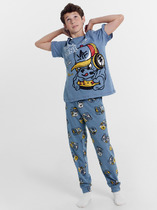 Трикотажный пижамный комплект из натурального хлопка. У джемпера длинные втачные рукава. Брюки с удобным поясом на резинке и утягивающим плетеным шнуром. Оригинальная набивка выполнена из стойких, гипоаллергенных текстильных красителей. Все трикотажные полотна производятся в соответствии с нормами Швейцарского сертификата ЭкоТекс.