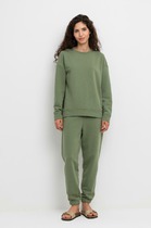Пояс регулируется вязаным шнуром в тон брюк. Плотная фактура вязания согревает и сохраняет форму во время носки.