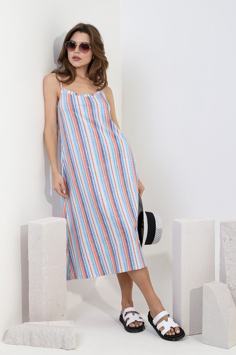 Сарафан молодежный из трикотажного полотна «кулирка» с набивным рисунком в полоску, полуприталенного силуэта на тонких бретелях, с карманами в боковых швах. Вырез горловины полочки и спинки обработаны притачной планкой из основного материала, проймы окантованы.