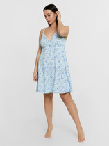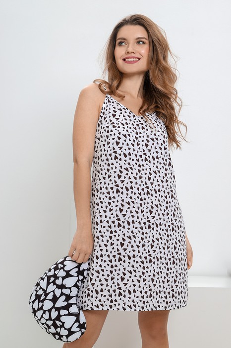 Сорочка молодежная из тканого штапельного полотна с набивным рисунком, свободного покроя, слегка расширенная книзу, на узких бретелях. На полочках – вытачки в области груди. Вырез горловины и проймы окантованы основным материалом. Для регулирования бретелей по длине предусмотрены пластмассовые пряжки и кольца – держатели, устанавливаемые на бретелях.