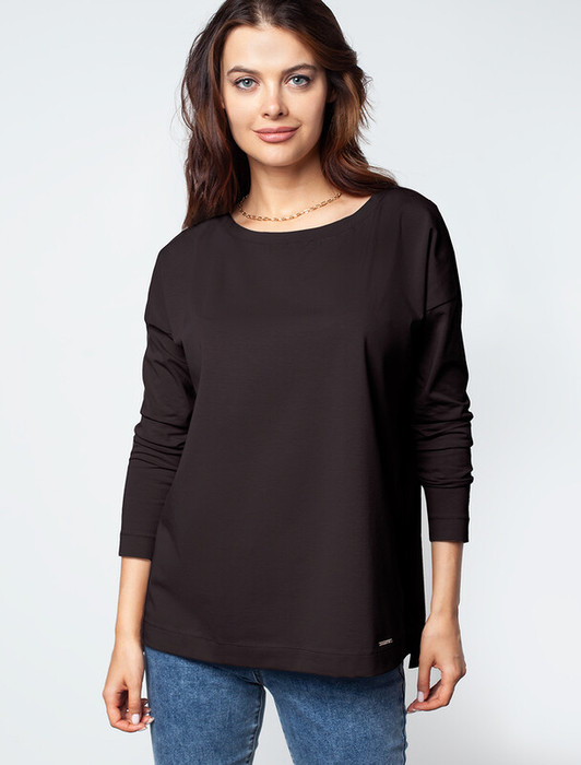 Свободный базовый джемпер черного цвета с длинными рукавами и круглым вырезом сшит из премиального хлопка. Однотонная хлопковая модель хорошо поддерживает комфортный для тела микроклимат. Благодаря вплетению эластановых волокон вещь хорошо сохраняет форму. Подходит для любого типа фигуры.