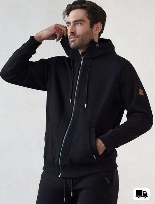 Худи на молнии выполнено из премиального эластичного футера трехнитки с теплым начесом. Модель с капюшоном и воротом стойка дополнена боковыми карманами и нашивкой с логотипом бренда из эко-кожи. Ранней осенью или поздней весной можно носить в качестве верхней одежды. Высококачественная фурнитура цвета темное серебро. Изделие сочетается в костюме с брюками U44.006
